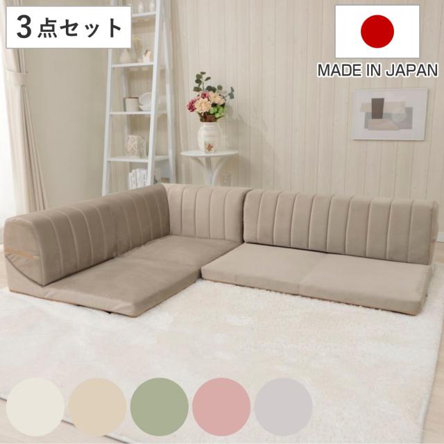 コーナーソファ 3点セット ベロア 日本製 ( ローソファ フロア ソファー l字 ロータイプ レイアウト 組合せ 自由 リクライニング 洗えるカバー くすみカラー かわいい おしゃれ )