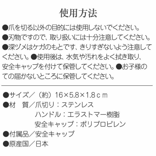 | 使用上のご注意 | ●爪を切る以外の目的には使用しないでください。 ●刃物ですので、取り扱いには十分注意してください。 ●深ヅメはケガのもとです。切りすぎないよう注意してください。 ●使用後は、水気や汚れを良く拭き取り、安全キャップを付けて保管してください。 ●お子様の手の届かないところに保管してください。 |
