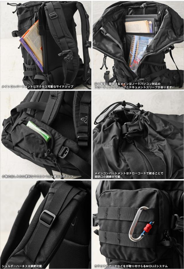 調整可能なフューチュラヨークシステムを装備し、ポケット付きの取り外し可能なパット付きウエストベルトを採用。体にフィットし、荷物の重量に応じた設計で、快適に使用することができます。トップリッドを外し、シュラウドとサイドジッパーを開けることにより扇形に広く開閉するメインコンパートメントは、荷物の出し入れ、整理整頓が非常に行いやすくなっています。メインに備わったパッド入りのラップトップPCスリーブは、ボトムから少し底上げされているので、パックを置いた際に衝撃がダイレクトに伝わらない設計です。