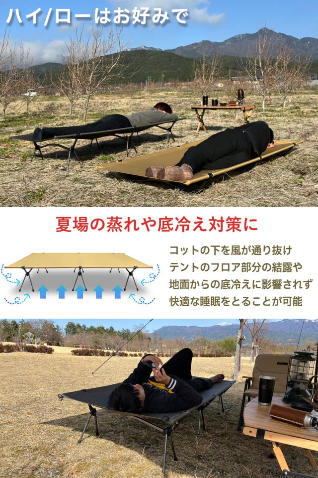 コットのメリットはサイトの環境に左右されることなく、睡眠スペースを確保できる点だと思います。