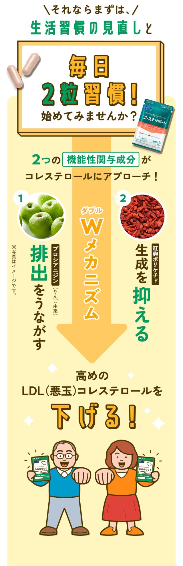 本品には紅麹ポリケチド・りんご由来プロシアニジンが含まれるので、LDL(悪玉)コレステロールが高めの方のLDL(悪玉)コレステロール、総コレステロール、LH比[LDL(悪玉)コレステロールとHDL(善玉)コレステロールの比率を示す値]、non-HDLコレステロール[総コレステロールからHDLコレステロールを引いた値]を下げる機能があります。コレステロールが高めの方に適しています。
