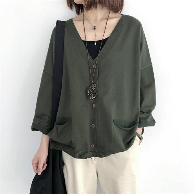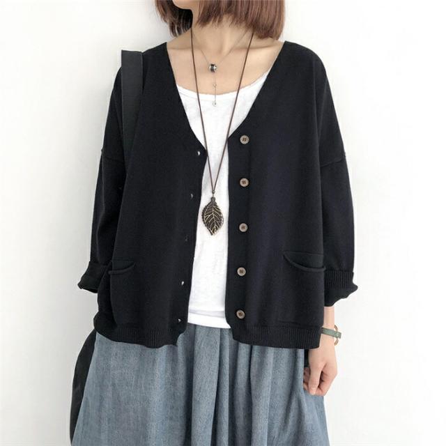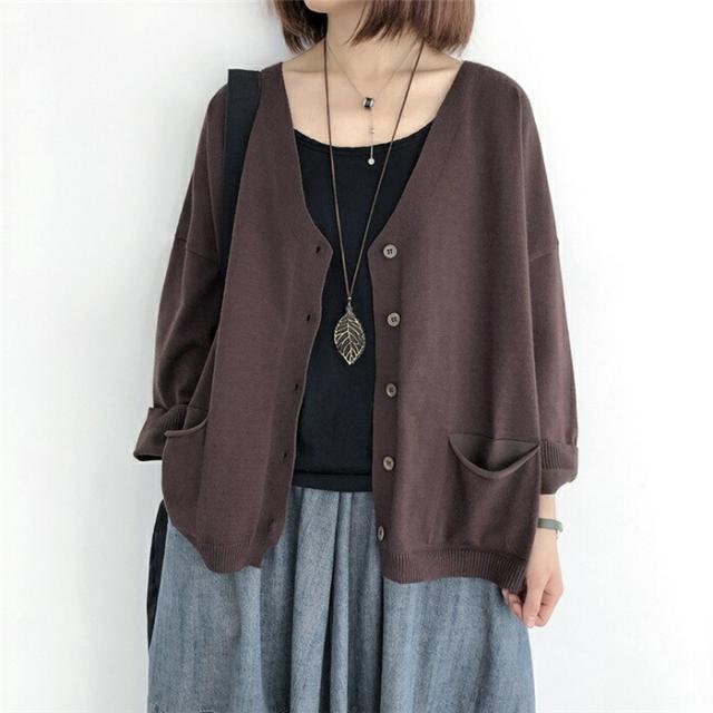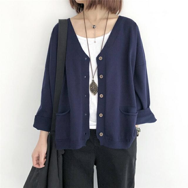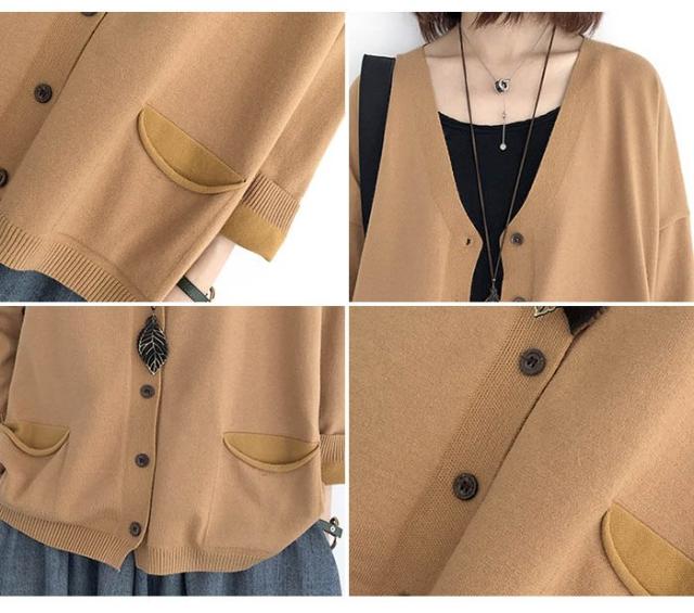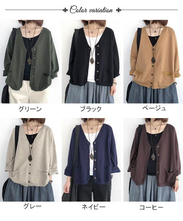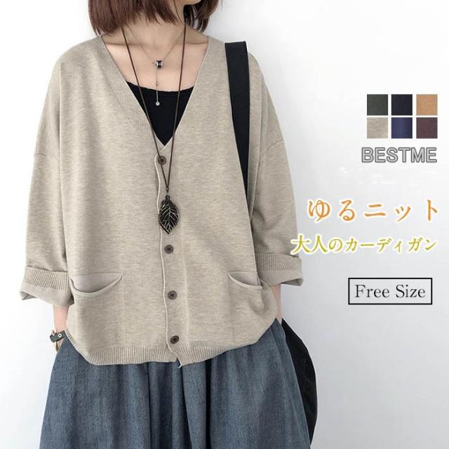 ニット カーディガン レディース トップス Vネック ショート丈 コットン セーター カーデ ポケット付き 羽織り 長袖