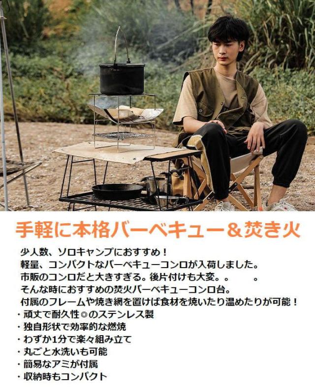 | バーベキューコンロ 焚き火台 折りたたみ式 LTG キャンプ 釣り ツーリング ソロキャンプ アウトドア 七輪 しちりん 炭火焼 BBQ コンパクト 送料無料 ■特徴 少人数、ソロキャンプにおすすめ! 軽量、コンパクトなバーベキューコンロが入荷しました。 市販のコンロだと大きすぎる。重いね後片付けも大変。。 そんな時におすすめの焚火バーベキューコンロ台。 付属のフレームや焼き網を置けば食材を焼いたり温めたりが可能! ・頑丈で耐久性◎のステンレス製 ・独自形状で効率的な燃焼 ・わずか1分で楽々組み立て ・丸ごと水洗いも可能 ・簡易なアミが付属 ・収納時もコンパクト ■仕様 炭置き板×2 可変スタン1ド×1 灰受け皿×1 フレーム×3 焼き網×1 収納袋×1 日本語説明書×1 ■カラー シルバー ※カラーは各々のモニターにより、多少の違いがある事、ご了承下さいませ。 ■サイズ 折りたたみ寸法:36cm×25cm×4cm 展開寸法:25cm×38cm×21.5cm 重量:837g 耐荷重:11kg ■素材 ステンレス ■注意点 ※メーカーの製造ロット差で多少 デザインが変更になる場合があります。 ※海外輸入の商品になりますので多少の汚れ、傷がある場合があります。 | ||