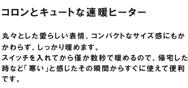 丸々とした愛らしい表情、コンパクトなサイズ感にもかかわらず、しっかり暖めます。