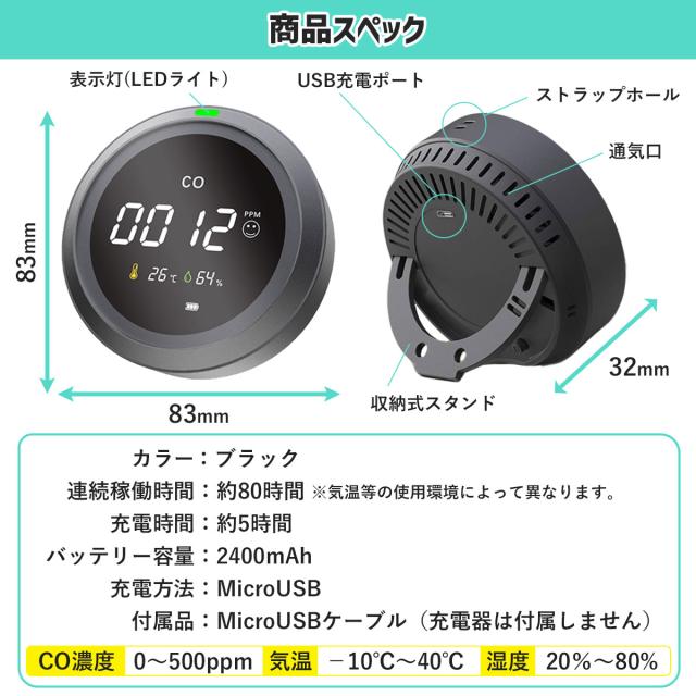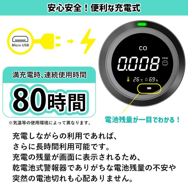 CO 一酸化炭素チェッカー チェッカー 警報器 警報機 警告 アラート アラーム キャンプ キャンプ用 ストーブ 灯油 灯油ストーブ ガス ガスストーブ 薪 薪ストーブ COアラーム キャンプアラーム 温度計 湿度計 一酸化炭素警報器 中毒 CO中毒 一酸化炭素中毒 車中泊 車内泊 防災 検知器 USB充電 LED おしゃれ 黒 ブラック 小型 軽量 小さい 軽い ミニ