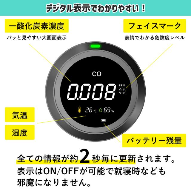 画面には気温/湿度/一酸化炭素濃度/バッテリー残量がデジタル形式で表示され、約2秒毎に更新されます。