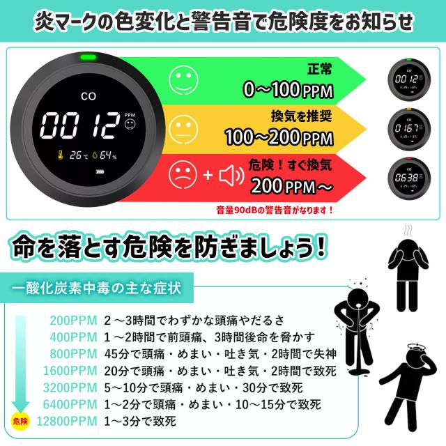 一酸化炭素濃度が200ppmを超えた瞬間に90デシベルの警告音が鳴り、周囲に危険を知らせます。(一酸化炭素のみを感知します。)