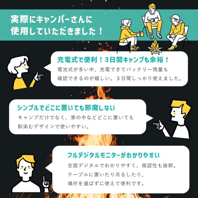 - 少し大きいかと思ったのですが、実際に車中泊で使うと数値も見やすく、ちょうど良い大きさでした。