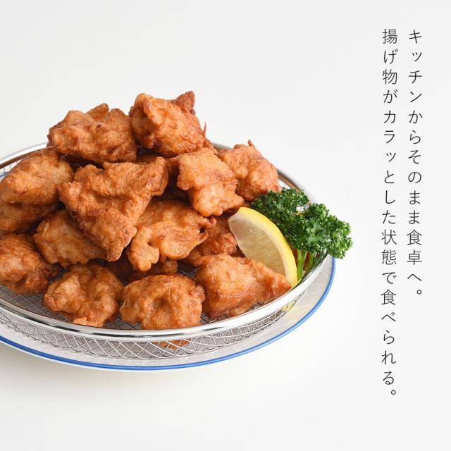 お皿のざるを使えば、ざるとお皿の間に自然な空間が生まれ、熱や湿気がしっかり逃げるため、揚げたてのカリッとした食感と美味しさをキープできます。