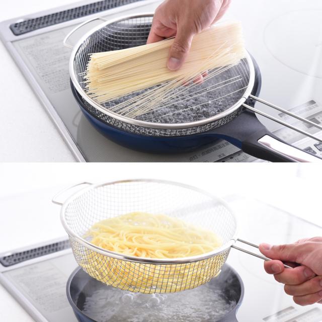 お手持ちのフライパン(直径24-26cmサイズ)と組み合わせて使用することで、野菜や麺を茹でるときはザルをサッと引き上げるだけで水切りができ、重たい鍋を持って湯切りをする手間が省けます。