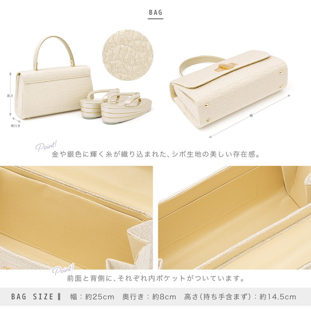 バッグは、金や銀色に輝く糸が織り込まれたシボのある素材で落ち着いた印象です。
