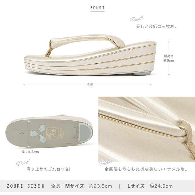 草履の天と鼻緒、巻きは同素材で、煌めくラメが散りばめられた優雅な美しさが引き立ちます。