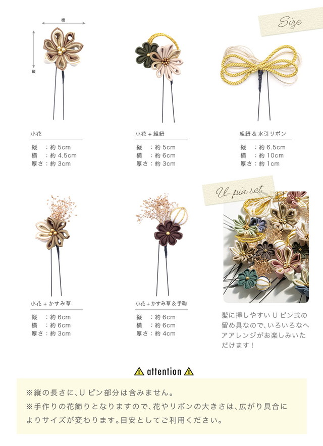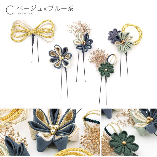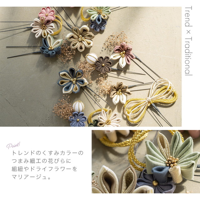 つまみ細工の花にドライフラワーが添えられ、組紐や水引に手毬などの数々の小物や小花は、ワントーンコーデにぴったりな落ち着いた雰囲気です。