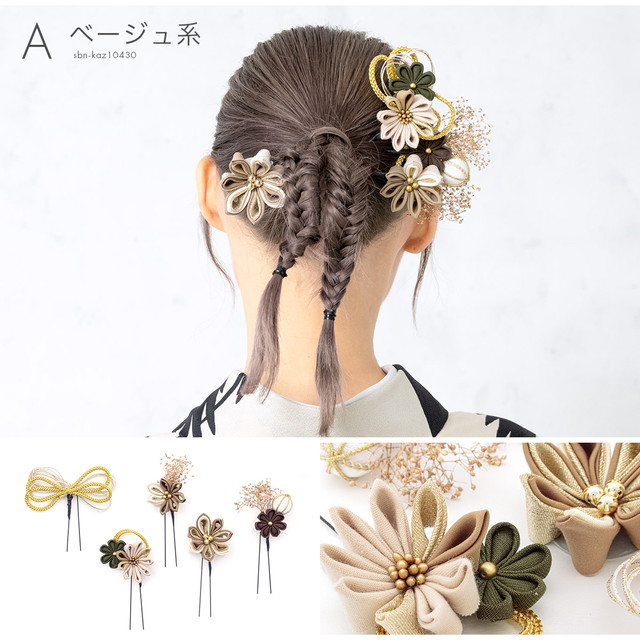 成人式 つまみ細工 髪飾り 水引 振袖 ドライフラワー かすみ草 5点セット 卒業式 袴 浴衣 ベージュ 茶系 ピンク 青 組紐 Uピン式 送料無料