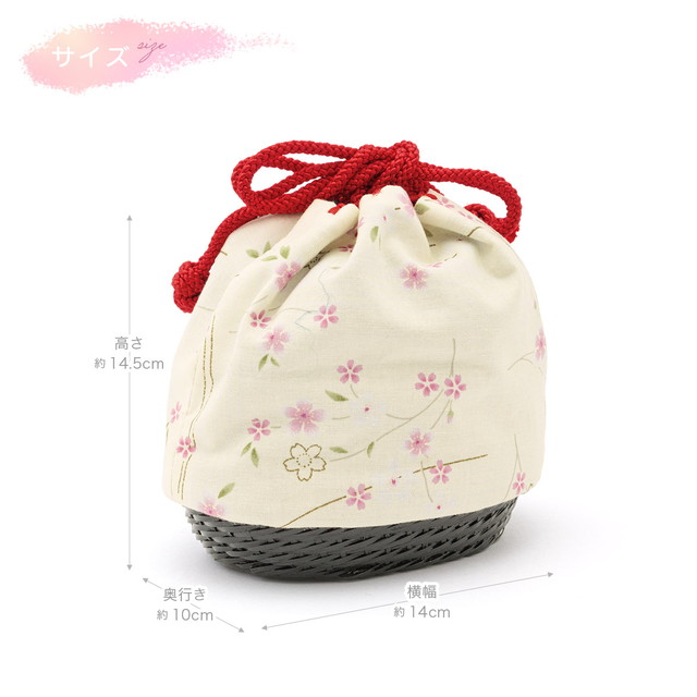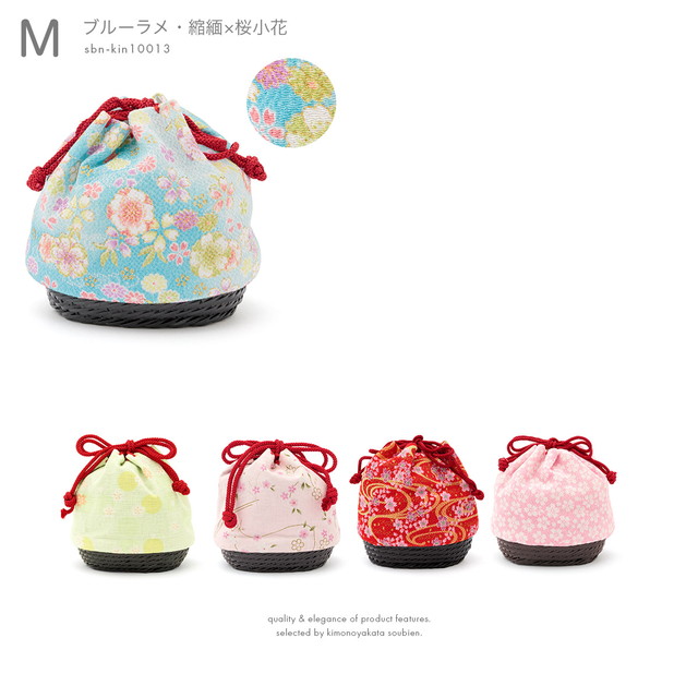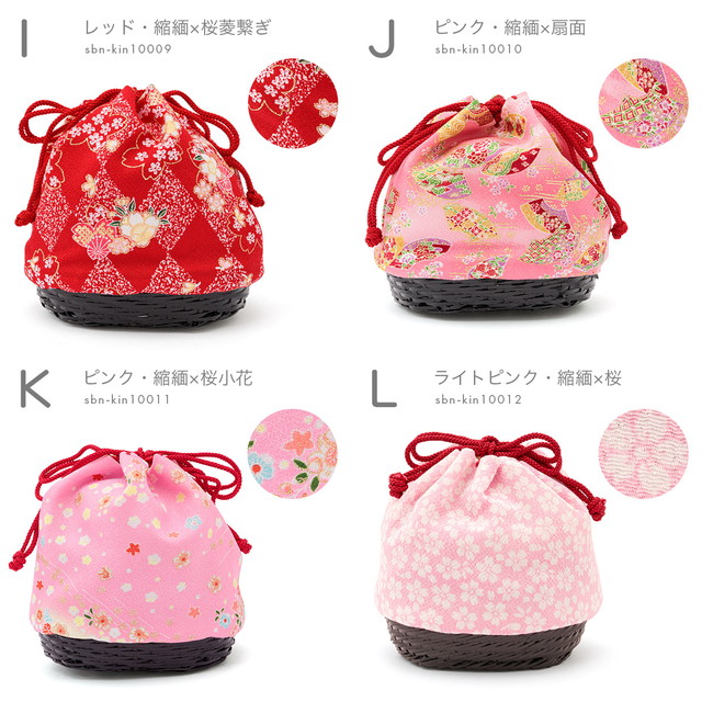 縮緬や紬調、平織などの素材のカラフルな色彩の巾着に、和柄が表現された愛らしいデザインです。