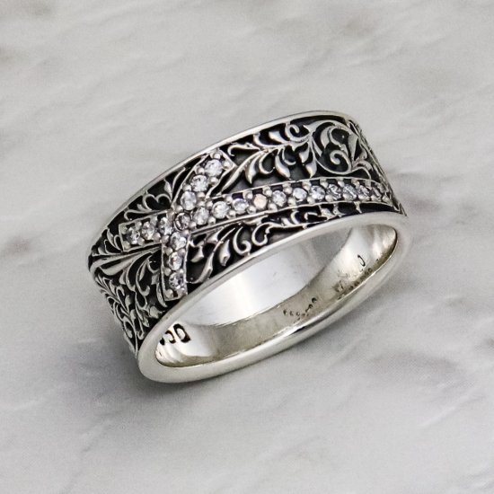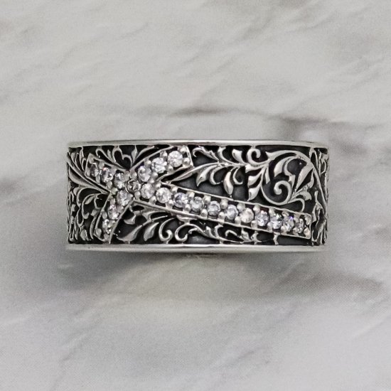 『力強い生命力』『永遠』が意味合いの蔦(アイビー)が繊細で細やかに掘り込まれ、アシメントリーにデザインしたクロスにはホワイトキュービックジルコニアがセットされた美しいリング。