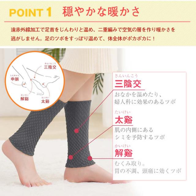 ●遠赤外線加工で足首をじんわりと温め、二重編みで空気の層を作り暖かさを逃がしません。足のツボをすっぽり温めて、体全体がポカポカに!