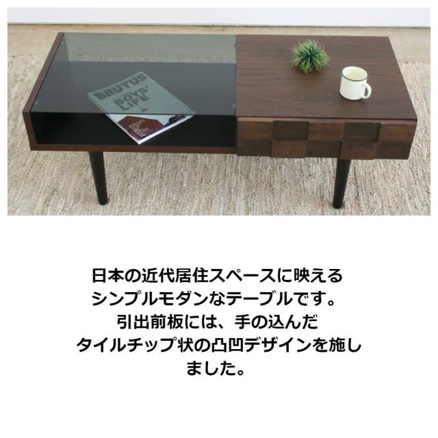 | 説明 | 日本の近代居住スペースに映える シンプルモダンなテーブルです。 引出前板には、手の込んだ タイルチップ状の凸凹デザインを施しました。 |