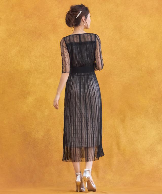 チュールドレス ワンピース シアー 5分袖 ミモレ丈 プリー