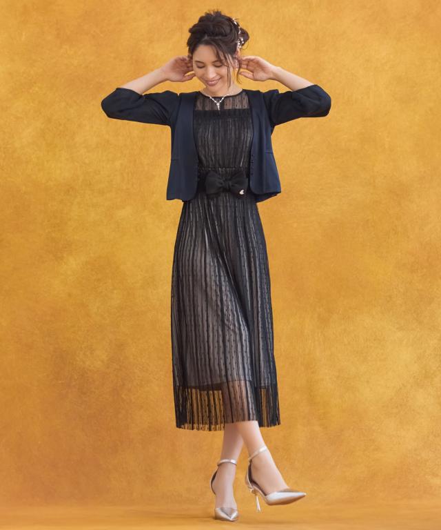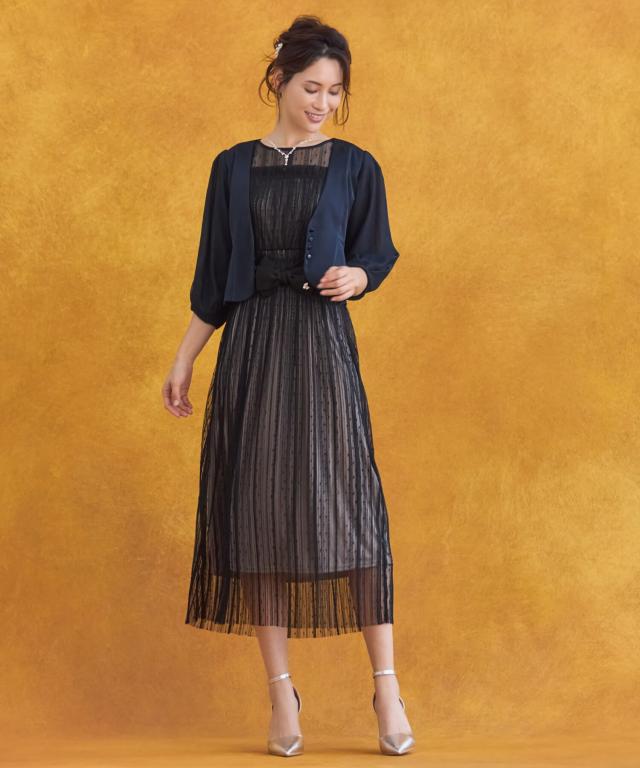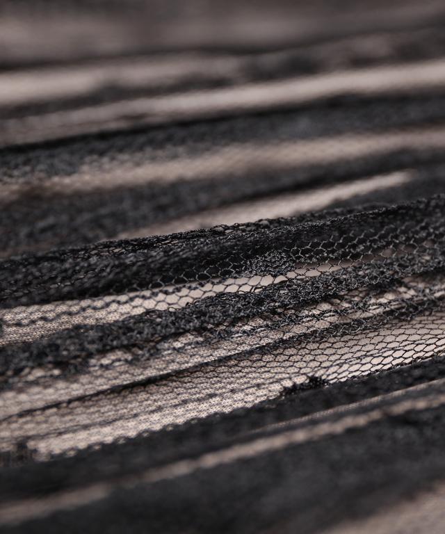 チュールのストライプ模様と、繊細なプリーツ加工がほっそり縦長を印象付け。