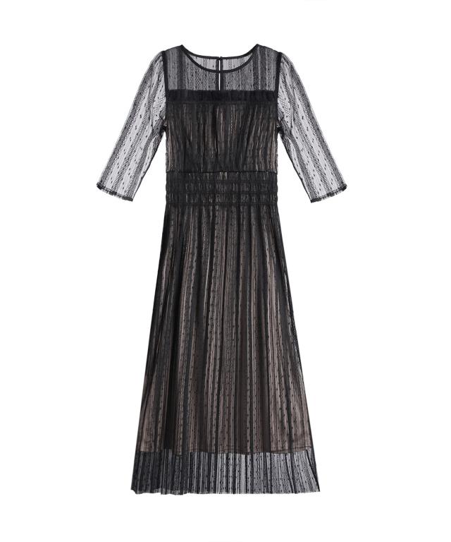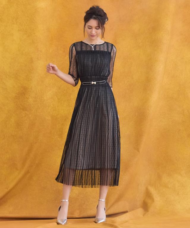 ドレスプラス(DRESS+)/チュールドレス ワンピース シアー 5分袖 ミモレ丈 プリー