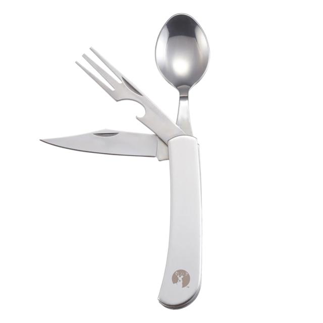 1.スプーン、2.フォーク、3.栓抜き、4.ナイフの機能が備わっています。柄の部分まで錆びにくく丈夫なステンレス鋼製でできています。