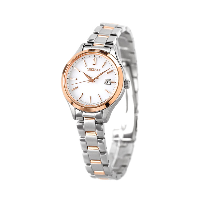 正規品 7年保証キャンペーン 送料無料 セイコーセレクション Sシリーズ 日本製 ソーラー レディース 腕時計 STPX096 SEIKO SELECTION アナログ ホワイト ピンクゴールド 白 ◆セイコーセレクション(SEIKO SELECTION)は、セイコーの考える時計の基本機能とデザイン性を追求。機能・品質・デザインのトータルバランスを重視する人へ向けたセレクションです。 繊細な斜面を持つ、流線形の美しいフォルムのケースデザインにすることで、ワンランク上の見栄えを実現しました。ダイヤル上には12箇所に立体的なインデックスを配置。視認性の高い太い針との組み合わせで、堂々としたデザインになりました。バンドはらくらくアジャスト方式で、ご自身でバンド調整も可能です。シンプルなデザインはビジネスからカジュアルにまでシーンを問わずお使いいただけ、誕生日や記念日などのプレゼントにもおすすめです。 発売日:22年11月発売 Sseries ペア シンプル