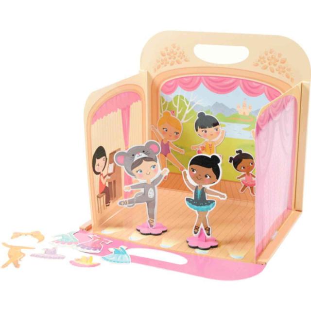 着せ替え遊びができるバレリーナのマグネットシートです。 見開いて簡単にバレエの劇場を組立てる事ができます。 専用の支柱でバレリーナを立たせて遊べます。マグネットシートにパーツをはめ込んで戻せば、楽しくお片付け完了。折り畳んで薄型・コンパクトに収納できるのでバッグに入れてもかさばりません。