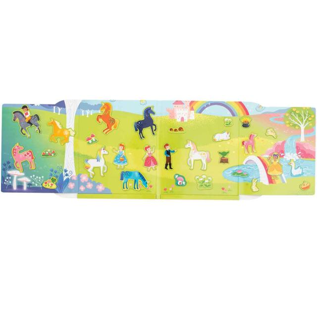 マグネットパーツを好きなところに貼り、お話作りやごっこ遊びができるマグネットバッグです。バッグを開けばマグネットシートになり、ユニコーンやプリンセスたちの、夢のような王国が広がっています。マグネットシートにパーツをはめ込んで戻せば、楽しくお片付け完了。折り畳んで薄型・コンパクトに収納できるのでバッグに入れてもかさばりません。