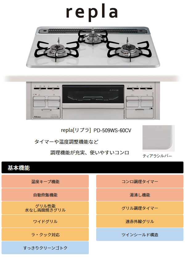 パロマ ビルトインコンロ リプラ 60cm【PD-509WS-60CV】ティアラシルバー