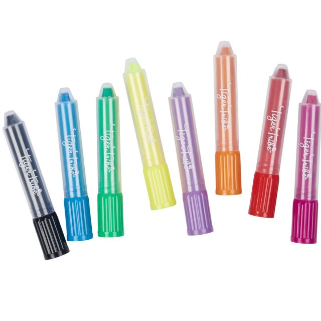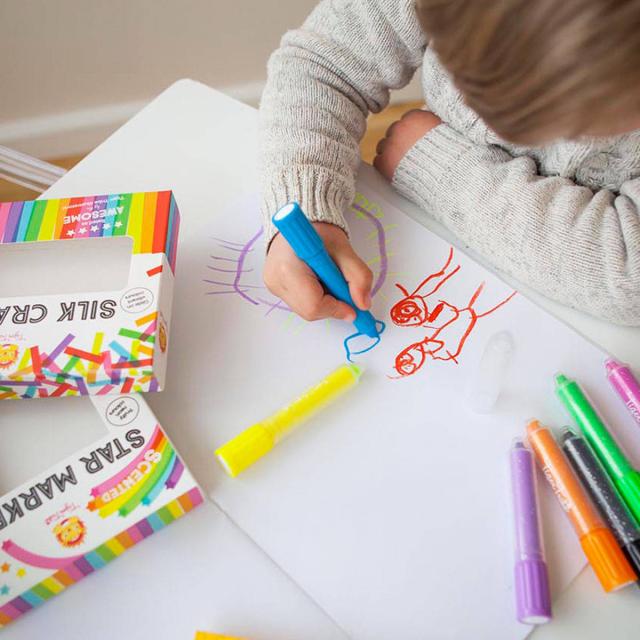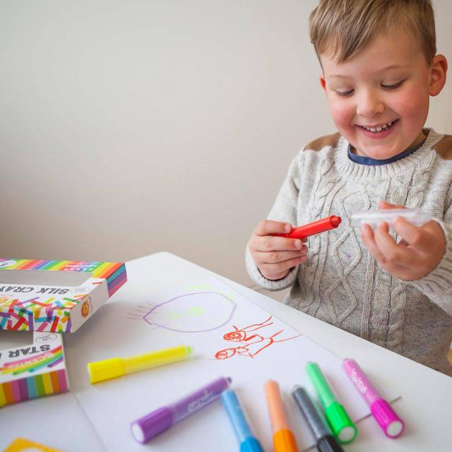 紙に描くのはもちろん、ガラスに描いたりトーンペイントの作品を作ったりと、遊びの幅が広がるクレヨンです。水溶性で、汚れても簡単に洗い流せます。