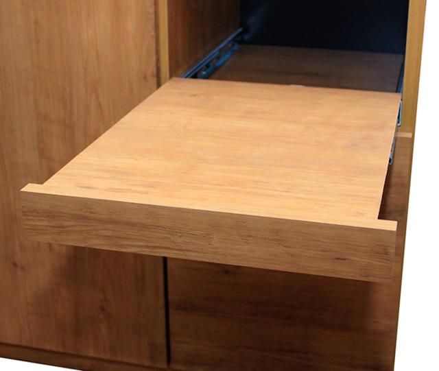 引出しの前面にはガラス窓があり、お気に入りのマグカップなどをディスプレイしてお楽しみいただけます。また、フルスライドレール仕様なので、奥の物まで見やすく出し入れもしやすいです。