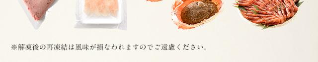 ・カット済み生ずわい蟹/ロシア、アラスカ、カナダ産ズワイガニ、酸化防止剤(亜硫酸塩)・殻付き牡蠣1kg/兵庫県産かき・サーモンいくら醤油漬け/サーモントラウト卵(いくらを含む)(デンマーク産)、粉末水あめ、食塩、しょうゆ(大豆・小麦を含む)、本みりん、発酵調味料、リンゴ酢(りんごを含む)、砂糖、カツオエキス、昆布エキス、たん白加水分解物(大豆・小麦を含む)、チキンエキス(鶏肉を含む)/調味料(アミノ酸等)、甘味料(ソルビトール)、増粘多糖類・ローストビーフ/牛肩肉(ポーランド)、香辛料、食塩、醤油、ビーフエキス、乳糖/調味料(アミノ酸等)、加工でん粉、(一部に小麦・乳成分・牛肉・大豆・ゼラチンを含む)・サバ開き/ノルウェー産さば、食塩・ハタハタ一夜干し/福井県越前町産ハタハタ、食塩・ネギトロ/まぐろ(台湾・韓国・日本)、植物油、食塩、pH調整材、酸化防止剤・つぶ貝スライス/ロシア産つぶ貝・蟹みそ甲羅盛り/紅ズワイガニ蟹味噌(日本、韓国)、紅ズワイガニ蟹身(日本)、デキストリン、醸造調味料、食塩、加工でん粉・甘エビ/福井県産甘えび