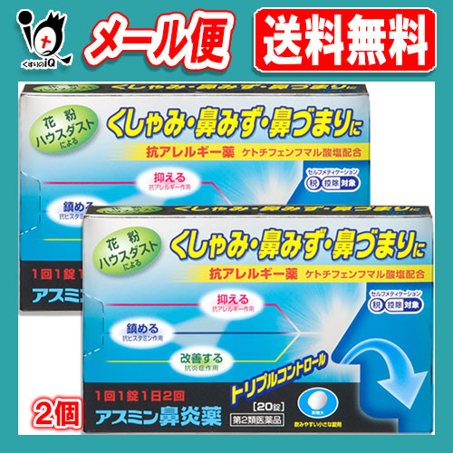 【第2類医薬品】★アスミン鼻炎薬 20錠×2個セット【薬王製薬】抗アレルギー薬 花粉・ハウスダストなどによるくしゃみ・鼻みず・鼻づまりに ケトチフェンフマル酸塩配合