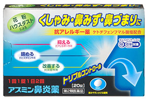 アスミン鼻炎薬は、出てしまった症状を鎮める抗ヒスタミン作用、アレルギー誘発物質の放出を元から抑える抗アレルギー作用、粘膜の炎症を改善し症状が繰り返し起こりにくい状態を保つ3つの働きを持つ「ケトチフェンフマル酸塩」を配合したお薬です。