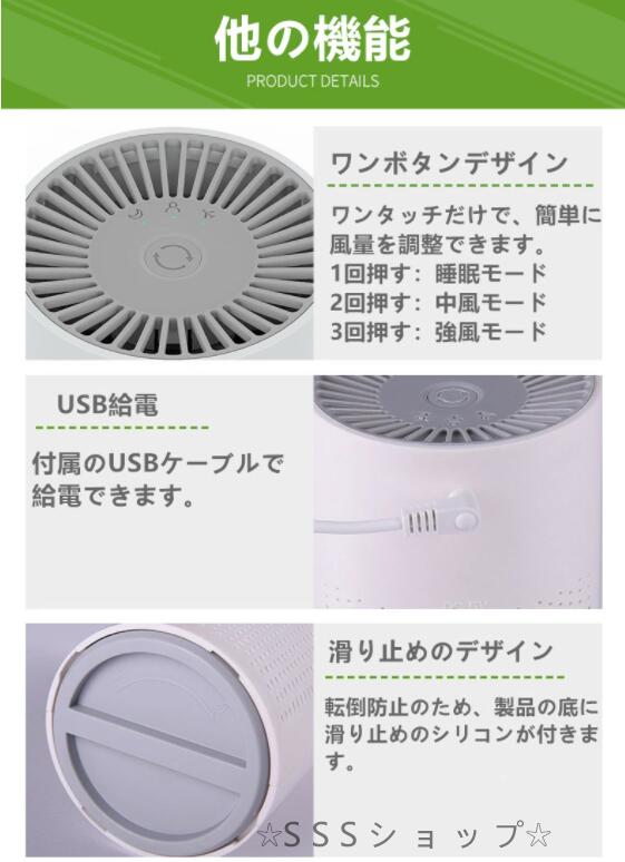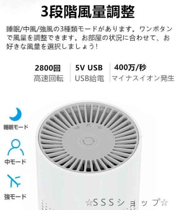 USB給電、美しいボディに強力なファンを搭載しているミニ空気浄化器です。加湿機能がなくので、菌が繁殖しにくい、単純に空気浄化力を究極に追求する。コンパクトのでどこでも置くできます。(リビング、子供部屋 、オフィス、ホテル、キッチンや玄関など場所)。1人暮らしの6畳程度の部屋だととても適用です!