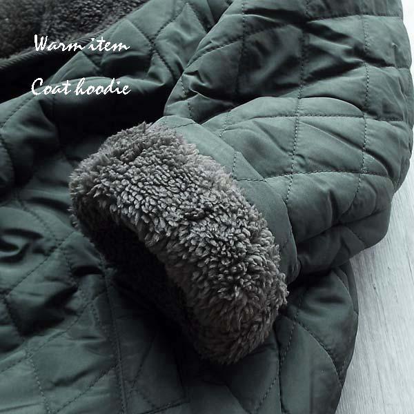 定番のキルティングコートはフードを付けることでよりカジュアルな仕上がりに。