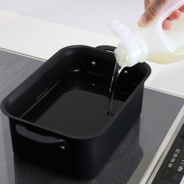 表面になじんだ油まで落とさないために、洗剤を使わずにお湯とタワシだけで洗います。使い始めはシリコーン塗装の被膜で保護されるので錆びにくい状態ですが、洗ったあとはしっかり水分をふき取り、加熱してわずかな水分も飛ばしてください。使えば使うほど、鍋に油がなじみ、使いやすい天ぷら鍋になります。
