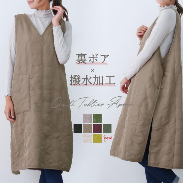 着やすくて、暖かい、と人気の裏ボア素材のワンピースのようにゆったり着れる、ロング丈のエプロン。表はキルティングで、裏が暖かいボア素材。ロング丈で腰回りまで暖かく、体温を逃さない。冬場の家事や、家の中でも快適に過ごせます。防寒着としてもオススメです。