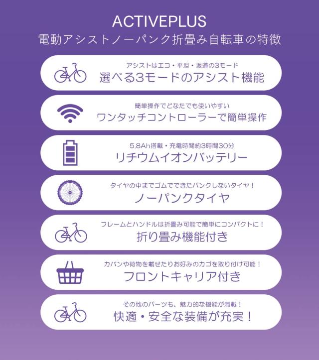 仕様 :アシスト機能・折畳みフレーム・折畳みハンドル・シングルギア