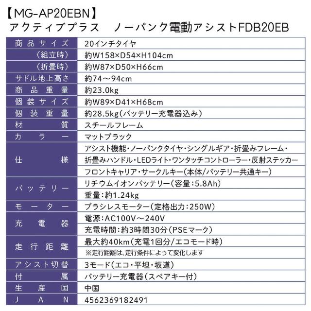 電動自転車 電動アシスト自転車 電動折り畳み自転車 20インチ ミムゴ ACTIVEPLUS ノーパンク 電動アシスト 自転車 FDB20EB マットブラック 代引不可 メーカー直送 折りたたみ 折り畳み 折り畳み自転車 折りたたみ自転車