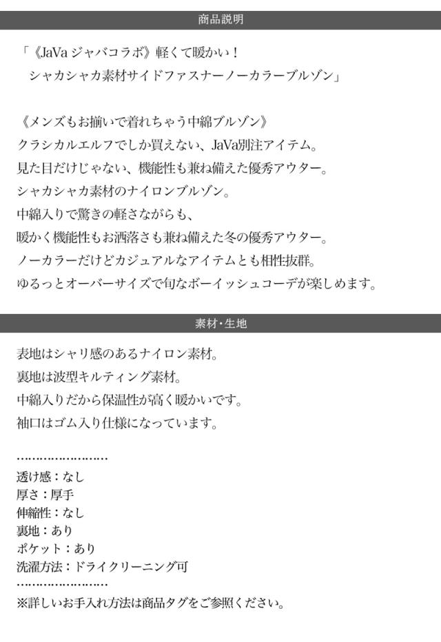 ★《JaVa ジャバコラボ》軽くて暖かい!シャカシャカ素材サイドファスナーノーカラーブルゾン★