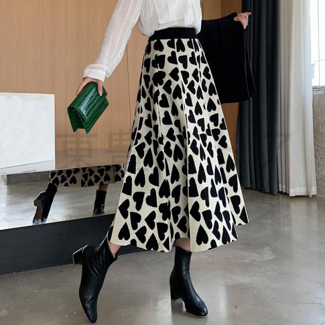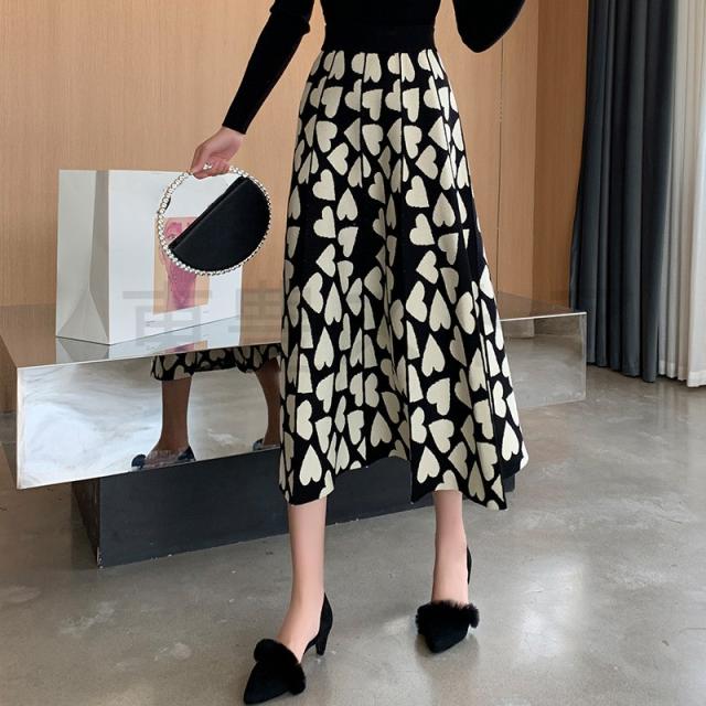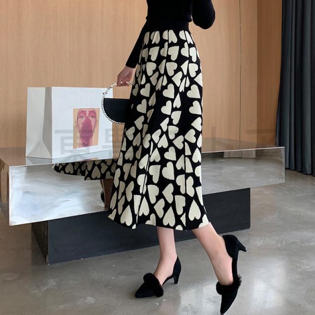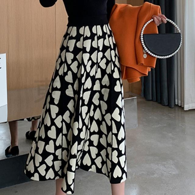 ニットスカート 厚手 ハート柄 体型カバー ロングスカート レディース ハイウエスト Aライン ゆったり 着痩せ 秋冬 デイリーコーデ 送料無料 大人かわいい カジュアル 女性らしい オフィスカジュアル 通勤 普段着 おしゃれ着 きれい