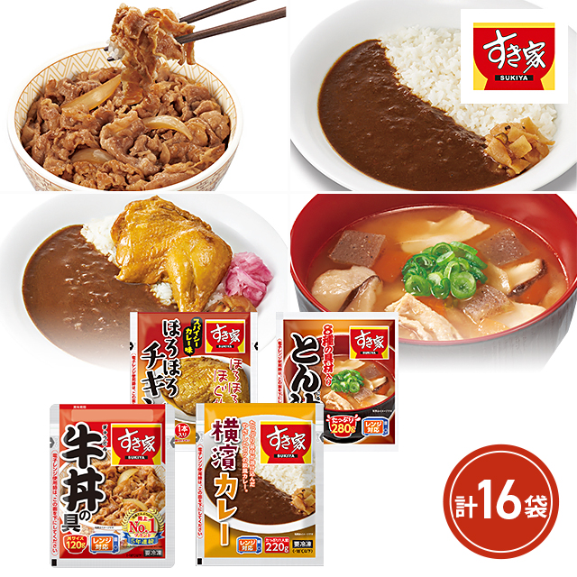 【ポイント増量中】 すき家 牛丼の具 横濱カレー ほろほろチキン とん汁のセット 計16袋 冷凍 総菜 牛丼 カレー 豚汁 とん汁 セット 冷凍食品