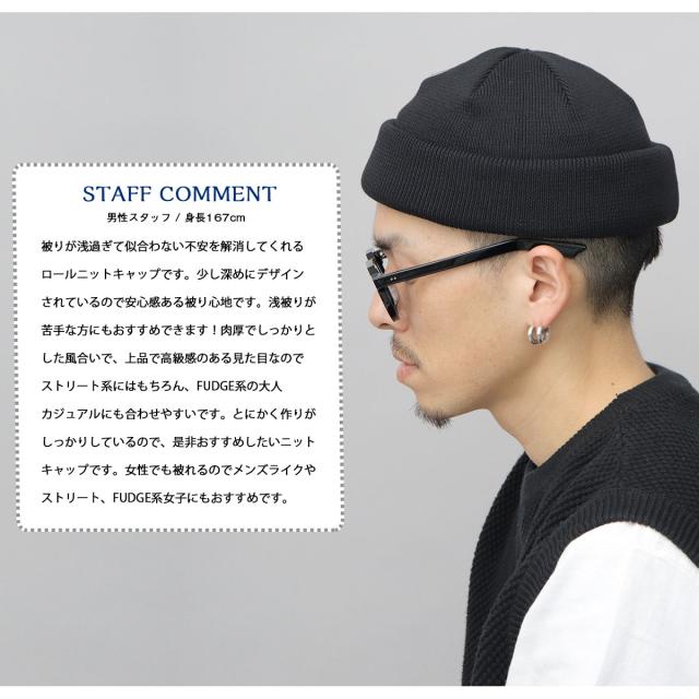 浅被りの良さを残しつつも、一般的なロールニットキャップに比べやや深さを出すことで安心感のある被り心地に。