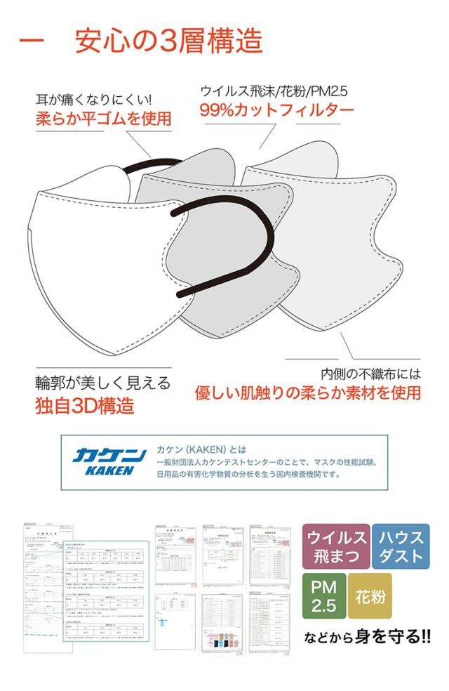 | 【マスクは国内検査機関(カケン)にて検査済】 〜〜〜JIS T 9001検査を実施〜〜〜 ◯各種飛沫の捕集効率に関する試験結果 ・微粒子捕集効率(PFE):99.9% ・バクテリア飛まつ捕集効率(BFE):99.9% ・ウイルス飛まつ捕集効率(VFE):99.9% ・花粉粒子捕集効率:99.9% ◯マスクの安全性に関する試験結果 ※検査結果に関する不明点は、メールにてお問い合わせください。 |