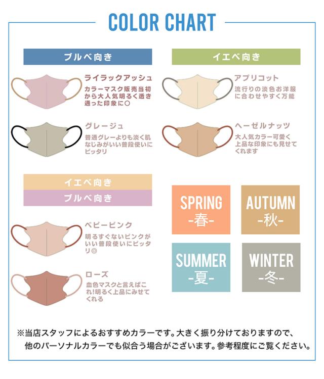| ◆一番似合うカラーが、魅力を引き出す パーソナルカラーとは生まれ持った肌・瞳・唇に似合う色のこと。 大きく春・夏・秋・冬のシーズンに分かれており、自分に似合う服・メイクをコーディネートするのに役立ちます。 パーソナルカラーに合ったマスクを付けると、肌色が明るく見える、フェイスラインがシャープに見える、等のメリットも。 Withマスク時代のいま、ファッションの決め手はカラーマスク。 あなたにぴったりの色、見つけてみませんか。 |