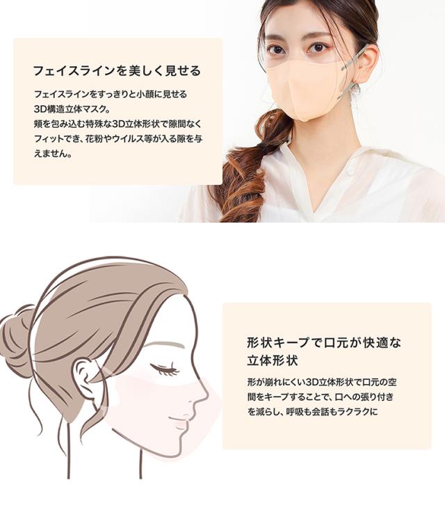 | ◆息や会話がしやすい立体形状マスク 形が崩れにくい特殊な立体形状で、口元の空間をキープ。 唇への張り付きが少なく、呼吸・会話も快適に。 頬を包み込む立体形状で隙間なくフィット。 フェイスラインもすっきり見せます。 ◆ノーズフィッターでフィット感UP ノーズフィッターを鼻の形に合わせることですき間を減らしぴったりフィット。 ◆ふんわりやさしくフィット、幅広耳ひも 伸縮性があるやわらかいコットン仕様の幅広耳ひもが、ふんわりとやさしく耳の形にフィット。 |