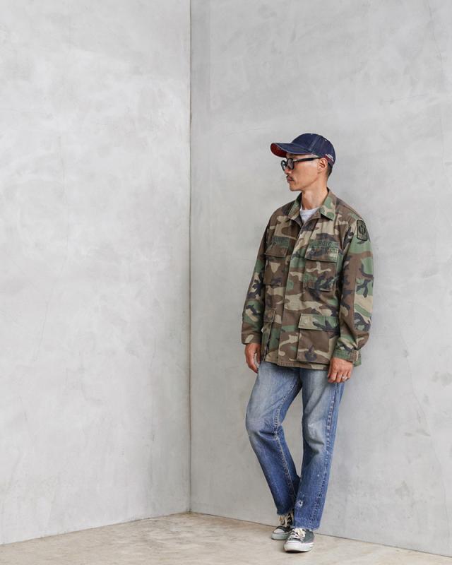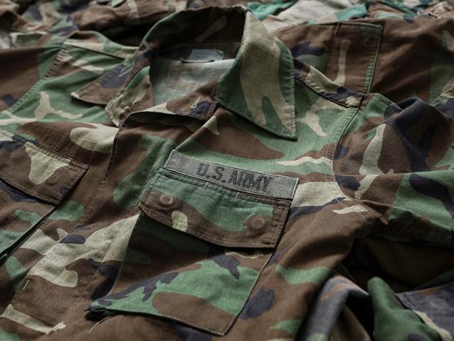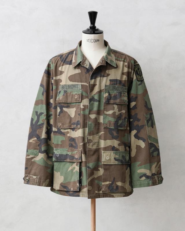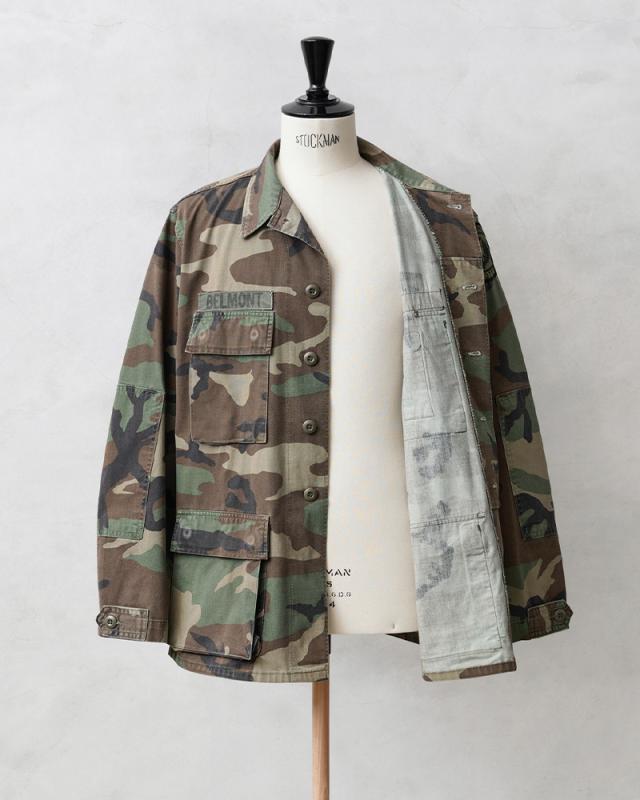 実物 USED 米軍 BDU WOODLAND CAMO ジャケット 中期型 ノンリップのご紹介です。こちらの中期型の特徴としては、1984年頃から1995年頃まで生産されたモデルで、胸ポケットのマチが外側に設けられており、襟の形状が中期型以降は小さくなり、袖口の調節用タブは前期、中期、後期になるにつれて幅広で短い形状へと変更されました。中期型にのみウエスト部分に調節用のアジャスターが付属しています。BDUとは「Battle Dress Uniform」の略で、戦闘服のことであり、BDUジャケットの特徴とも言える4つのフロントポケットは2重構造のフラップがついており、ボタンが外に露出しない仕様です。4箇所のポケットはマチ付きで立体的なデザインになっています。フロントは比翼仕立てでボタンが引っかからない仕様、肘部分には補強のためにあて布がされた2重構造、袖はボタンで調節可能、左胸のポケットの内側にはペンホルダーが備わっており、細部にまでこだわり抜かれたデザインとなっています。