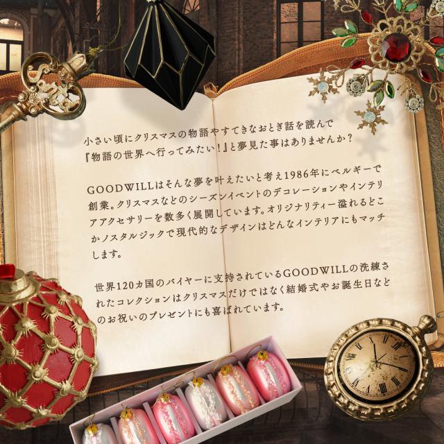 小さい頃にクリスマスの物語やすてきなおとぎ話を読んで 『物語の世界へ行ってみたい!』と夢見た事はありませんか? GOODWILLはそんな夢を叶えたいと考え1986年にベルギーで創業。クリスマスなどのシーズンイベントのデコレーションやインテリアアクセサリーを数多く展開しています。オリジナリティー溢れるどこかノスタルジックで現代的なデザインはどんなインテリアにもマッチします。 世界120カ国のバイヤーに支持されているGOODWILLの洗練されたコレクションはクリスマスだけではなく結婚式やお誕生日などのお祝いのプレゼントにも喜ばれています。 |